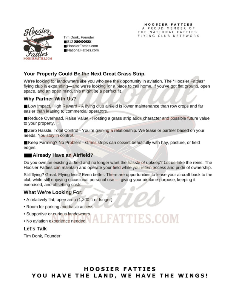 Whether it’s an existing airfield that’s underused, a private grass strip that is falling into disrepair, or even just a piece of land that could one day become a great new home base, we’re here to help. We’re developing outreach materials, templates, and support tools to help you approach landowners, farmers, and airport managers to show them the benefits of supporting grassroots aviation and how hosting a local Fatties chapter can be a win for everyone involved.